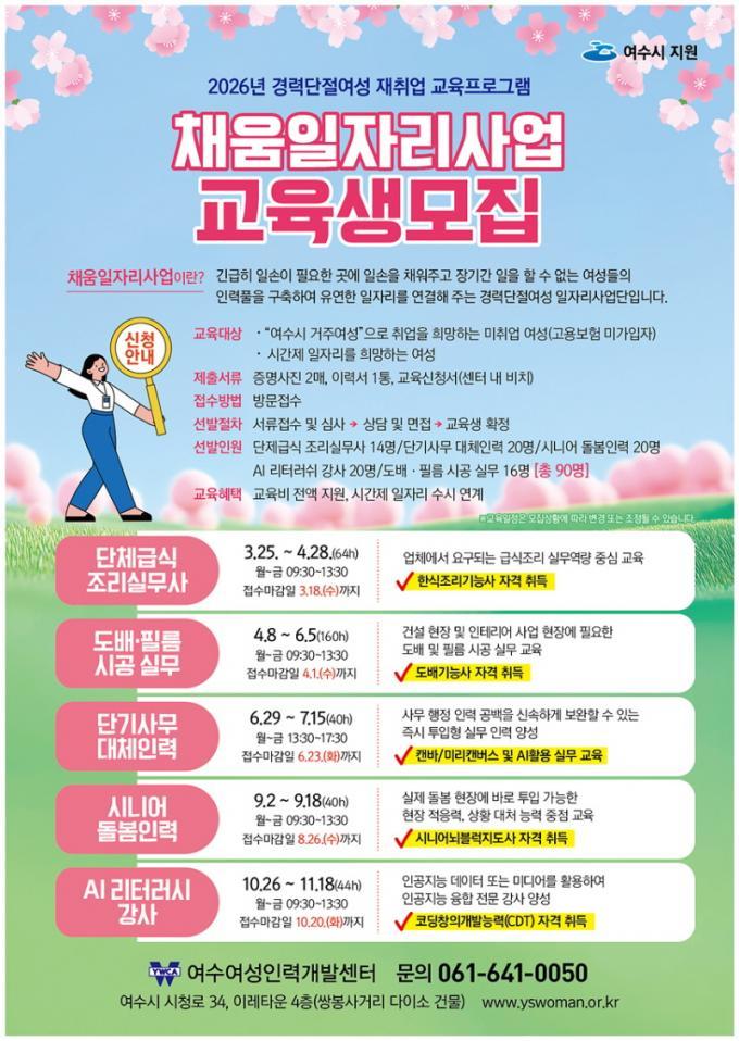 2026³â ÀçÃë¾÷±³À°ÇÁ·Î±×·¥Àº ±³À°°úÁ¤°ú ½Ç½ÀÀ¸·Î ¿©¼ºÀÎÀ縦 ¾ç¼ºÇÏ°í ±ä±Þ Àη ¼ö¿ä¿¡ ´ëÀÀÇÒ ÀηÂÇ®À» ±¸ÃàÇØ À¯¿¬ÇÑ ÀÏÀÚ¸®¿Í ¿¬°èÇÏ´Â ÀÚ°ÝÃëµæ¡¤½Ç¹«Á᫐ °úÁ¤ÀÌ´Ù.