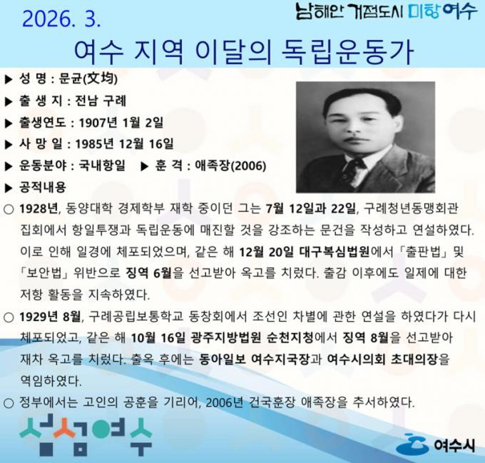 | ¿©¼ö½Ã, 2026³â 3¿ùÀÇ µ¶¸³¿îµ¿°¡ ¡®¹®±Õ(Ùþг)¡¯ ¼±»ý ¼±Á¤ ¾çÀçºÀ ±âÀÚ yjb66@nate.com |