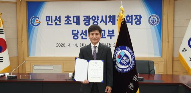 [µ¿ºÎŸÀÓÁî = ¾çÀçºÀ ±âÀÚ] ±¤¾ç½Ã üÀ°È¸Àå¼±°Å°ü¸®À§¿øÈ¸(À§¿øÀå ¹ÚÁöÀ±)°¡ 4¿ù 14ÀÏ ½Ãû »óȲ½Ç¿¡¼ üÀ°È¸ ÀÓ¿ø°ú ¼±°Å°ü¸®À§¿ø µî 20¿© ¸íÀÌ Âü¼®ÇÑ °¡¿îµ¥ ¹Î¼± ÃÊ´ë üÀ°È¸ÀåÀ¸·Î ¼±ÃâµÈ Á¤½ÃÈ ´ç¼±Àο¡°Ô ´ç¼±ÁõÀ» Àü´ÞÇß´Ù.