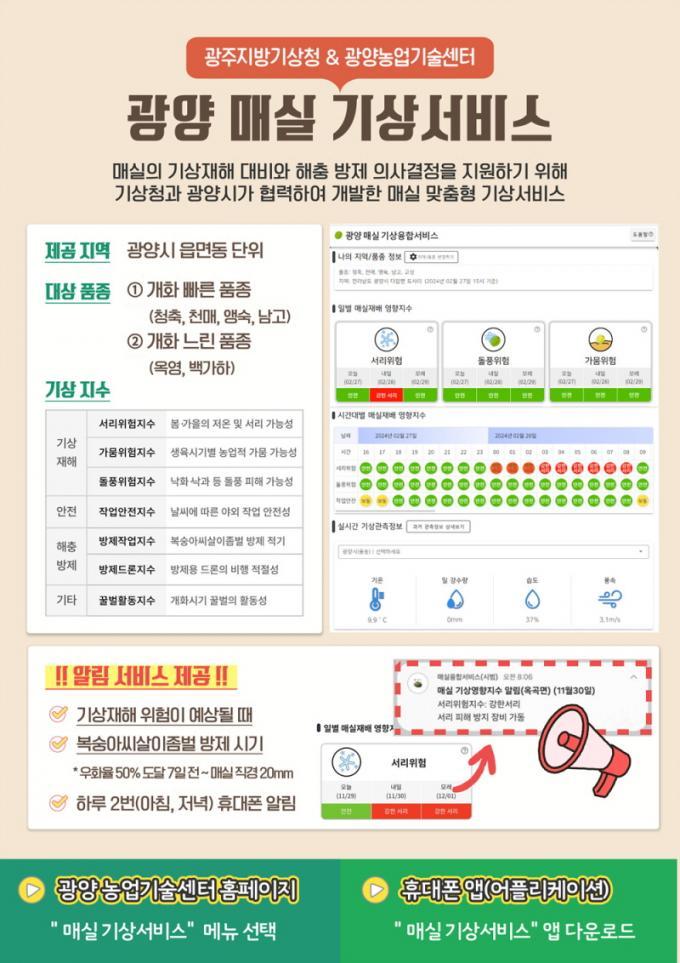 ¸Å½Ç ±â»ó¼ºñ½º(plum.gwangyang.go.kr)´Â ±¤¾ç½Ã ³ó¾÷±â¼ú¼¾ÅÍ È¨ÆäÀÌÁö¿¡¼ È®ÀÎÇÒ ¼ö ÀÖÀ¸¸ç, ¾Èµå·ÎÀ̵å ÈÞ´ëÆùÀÇ °æ¿ì ¸Å½Ç ±â»ó¼ºñ½º ¾ÛÀ» ¼³Ä¡ÇÏ¸é ±â»óÀçÇØ¡¤¹æÁ¦½Ã±â ÀÚµ¿ ¾Ë¸² ¼ºñ½ºµµ ¹Þ¾Æº¼ ¼ö ÀÖ´Ù.