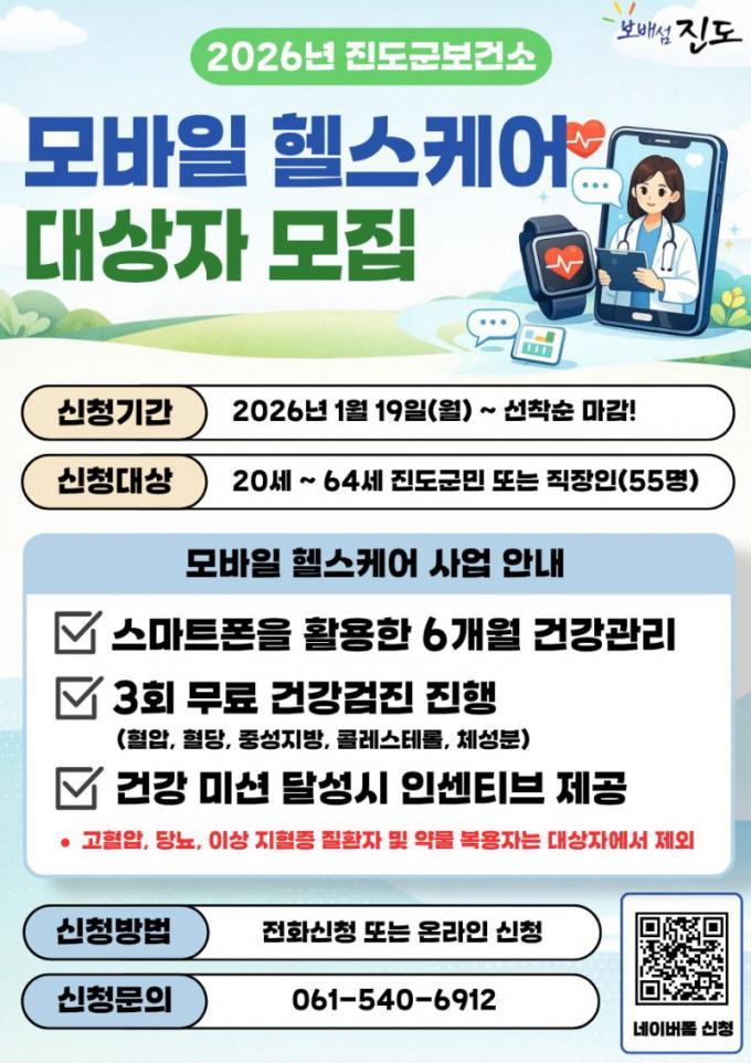| Áøµµ±º, 2026³â ¸ð¹ÙÀÏ ÇコÄɾî 1±â ´ë»óÀÚ ¸ðÁý ½º¸¶Æ® ±â±â ¿¬°è¸¦ ÅëÇÑ ¸ÂÃãÇü °Ç°°ü¸® »ç¾÷ ¼ºÁ¤È£ ±âÀÚ yjb66@nate.com |