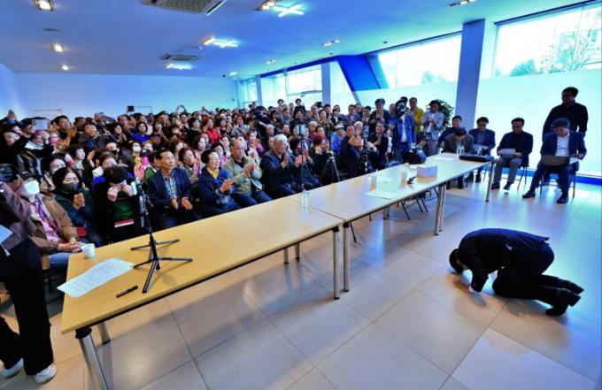 ±âÀÚȸ°ß¿¡¼ ¹Ú ¿¹ºñÈ帴 °æ¼± ºÒÂü¿¡ ´ëÇÑ ÀÔÀåÀ» ¹àÈ÷¸ç ½Ã¹Îµé¿¡°Ô »ç°úÇϰí, Å»´ç ¹è°æ°ú ÇâÈÄ °èȹÀ» ¼³¸íÇß´Ù. ÇöÀå¿¡´Â ¾à 300¸íÀÇ ÁöÁöÀÚµéÀÌ ÀÚ¹ßÀûÀ¸·Î Âü¼®ÇØ ¹Ú Èĺ¸ÀÇ ÀÔÀåÀ» °æÃ»Çß´Ù.