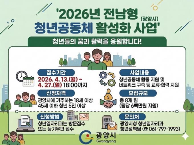 | ±¤¾ç½Ã, ¡®Àü³²Çü û³â°øµ¿Ã¼ Ȱ¼ºÈ »ç¾÷¡¯ Âü¿©ÆÀ ¸ðÁý 5ÀÎ ÀÌ»ó û³â°øµ¿Ã¼ ´ë»ó ÆÀº° ÃÖ´ë 600¸¸ ¿ø Áö¿ø¡¦ 4¿ù 27ÀϱîÁö Á¢¼ö ¾çÀçºÀ ±âÀÚ yjb66@nate.com |
